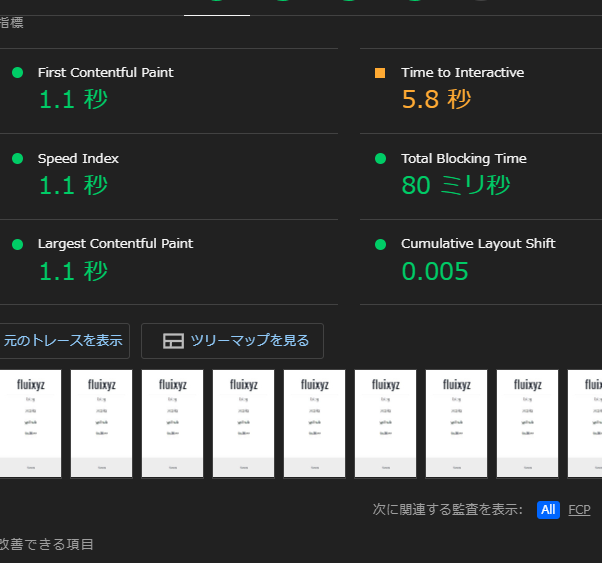 とにかくやりとりするファイルを小さくするのと、CSSで済む処理はCSSでやるのが大事って感じました。例えば、このサイトのfluixyz's logというタイトルはGoogle Fontsからフォントを落としてきているため表示にやや時間がかかっていたのですが、実際に表示される文字に絞ってダウンロードすることで表示を高速化できたりします。